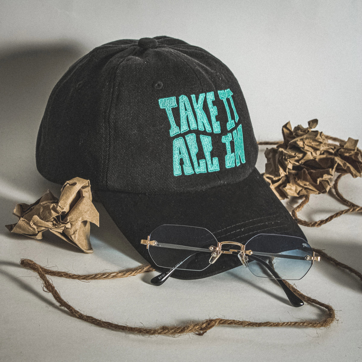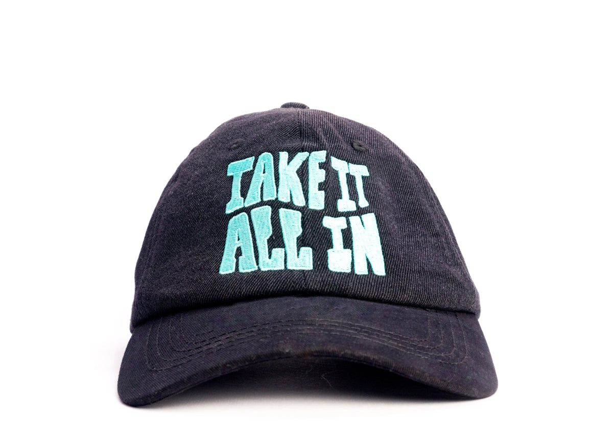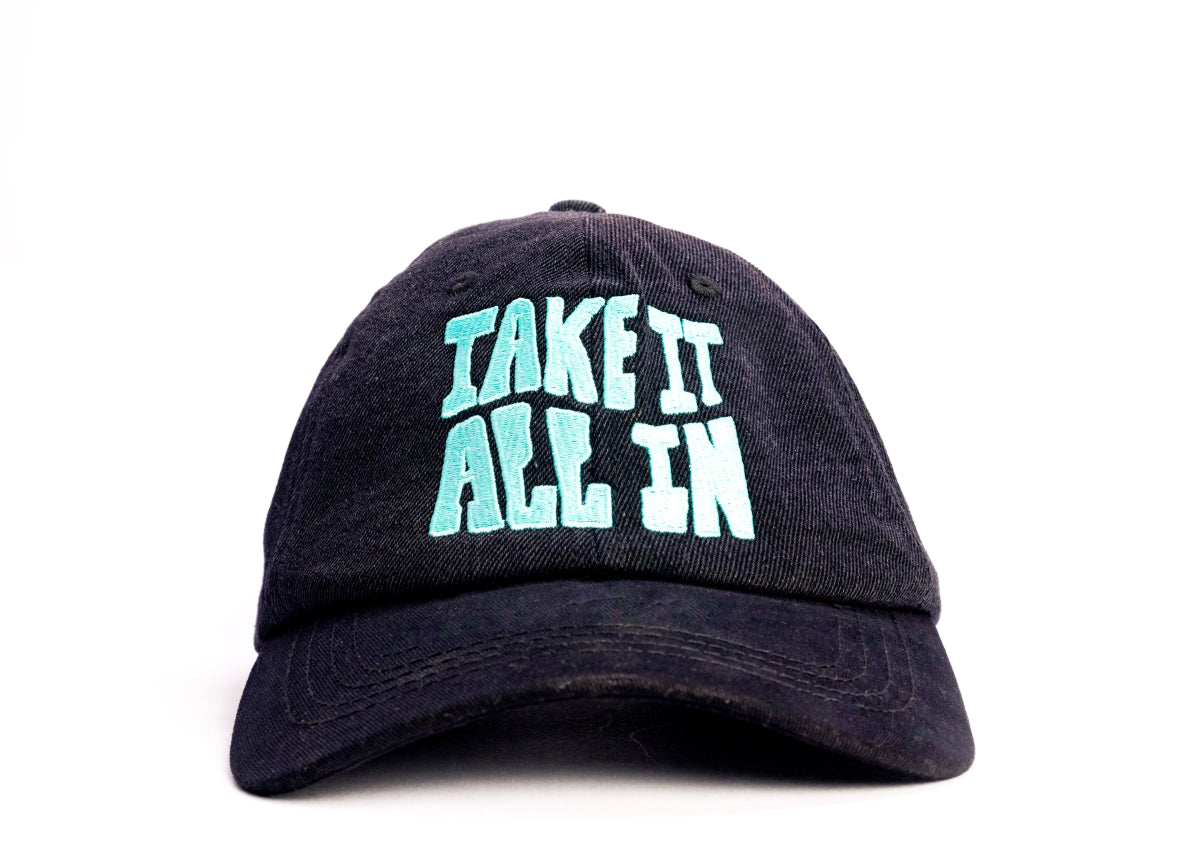 Rock a bold, stylish look with our Black Shade Flex Dad Hat, crafted from premium structured washed denim and a cotton visor for ultimate comfort. Featuring a vibrant "Take it all in" flat embroidery logo, this 6-panel cap adds a statement to any outfit. With a one-size-fits-all adjustable H-buckle and a 375-day stitching warranty, this cap offers both style and durability. Perfect for every day, from the streets to the shade!