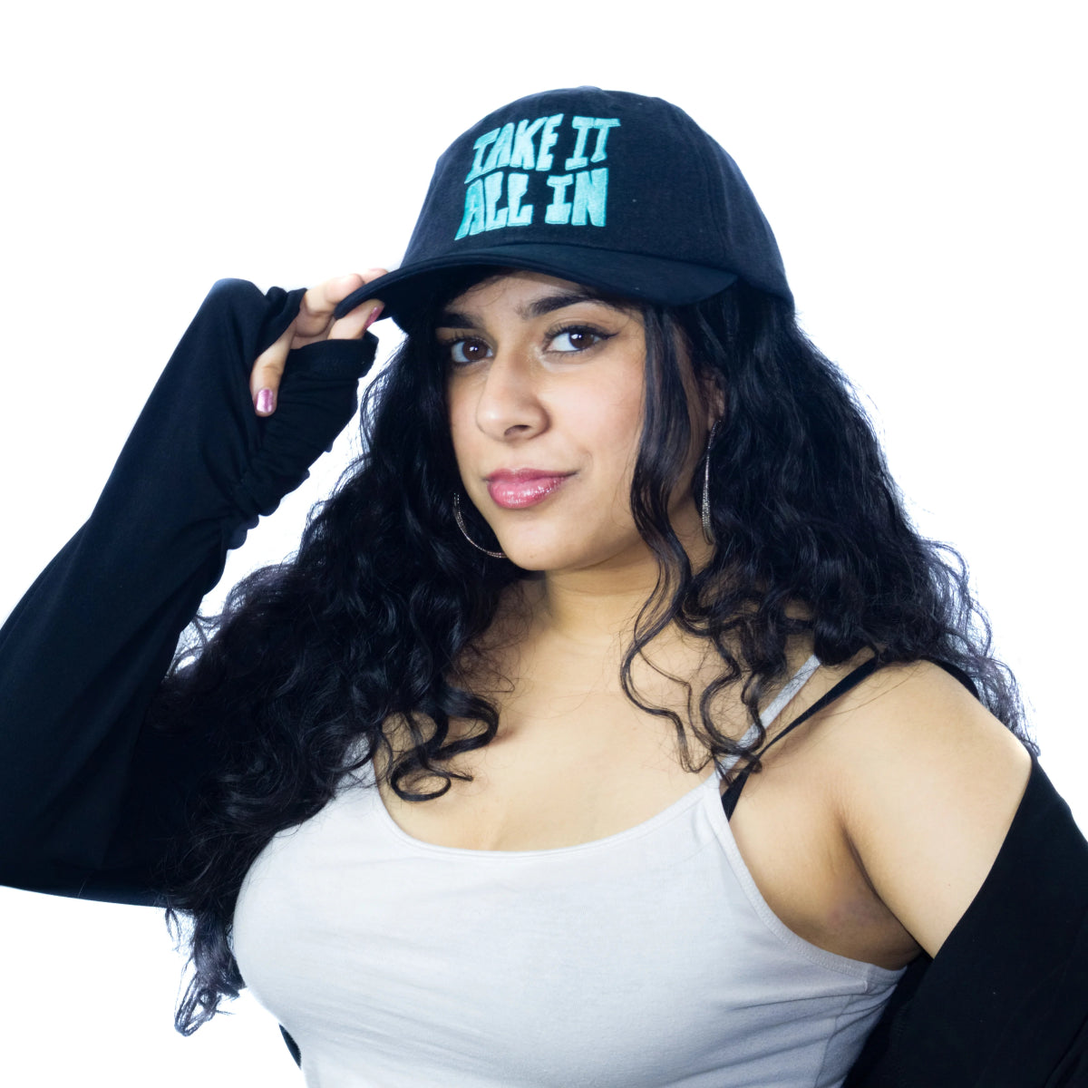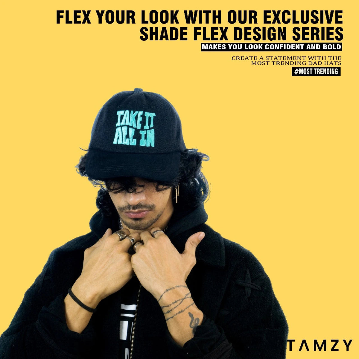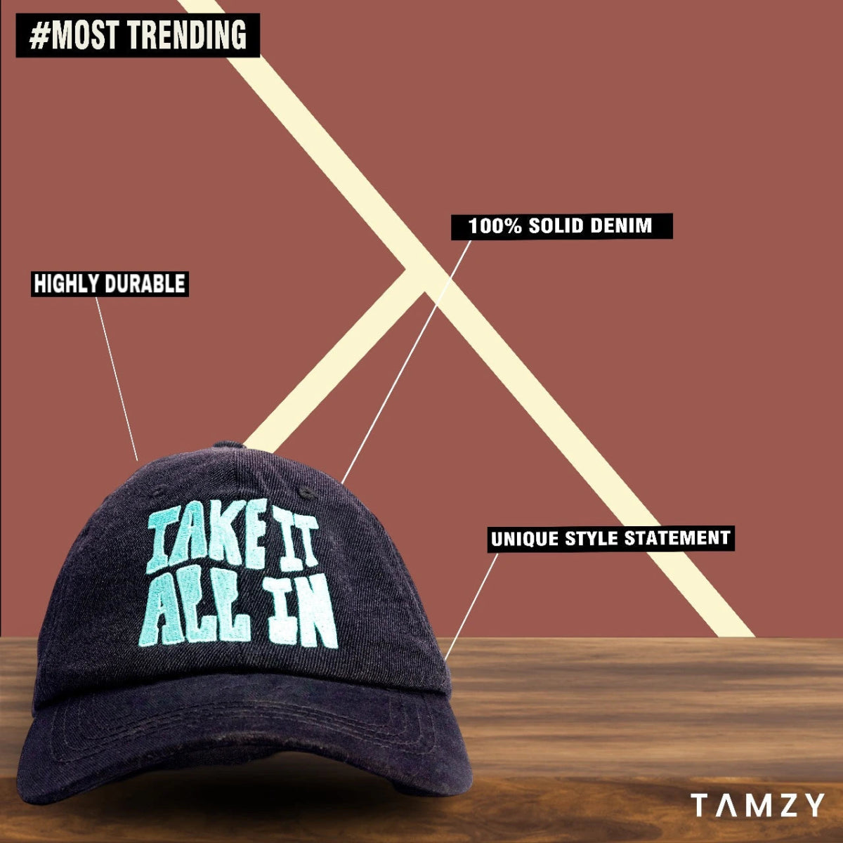 Rock a bold, stylish look with our Black Shade Flex Dad Hat, crafted from premium structured washed denim and a cotton visor for ultimate comfort. Featuring a vibrant "Take it all in" flat embroidery logo, this 6-panel cap adds a statement to any outfit. With a one-size-fits-all adjustable H-buckle and a 375-day stitching warranty, this cap offers both style and durability. Perfect for every day, from the streets to the shade!
